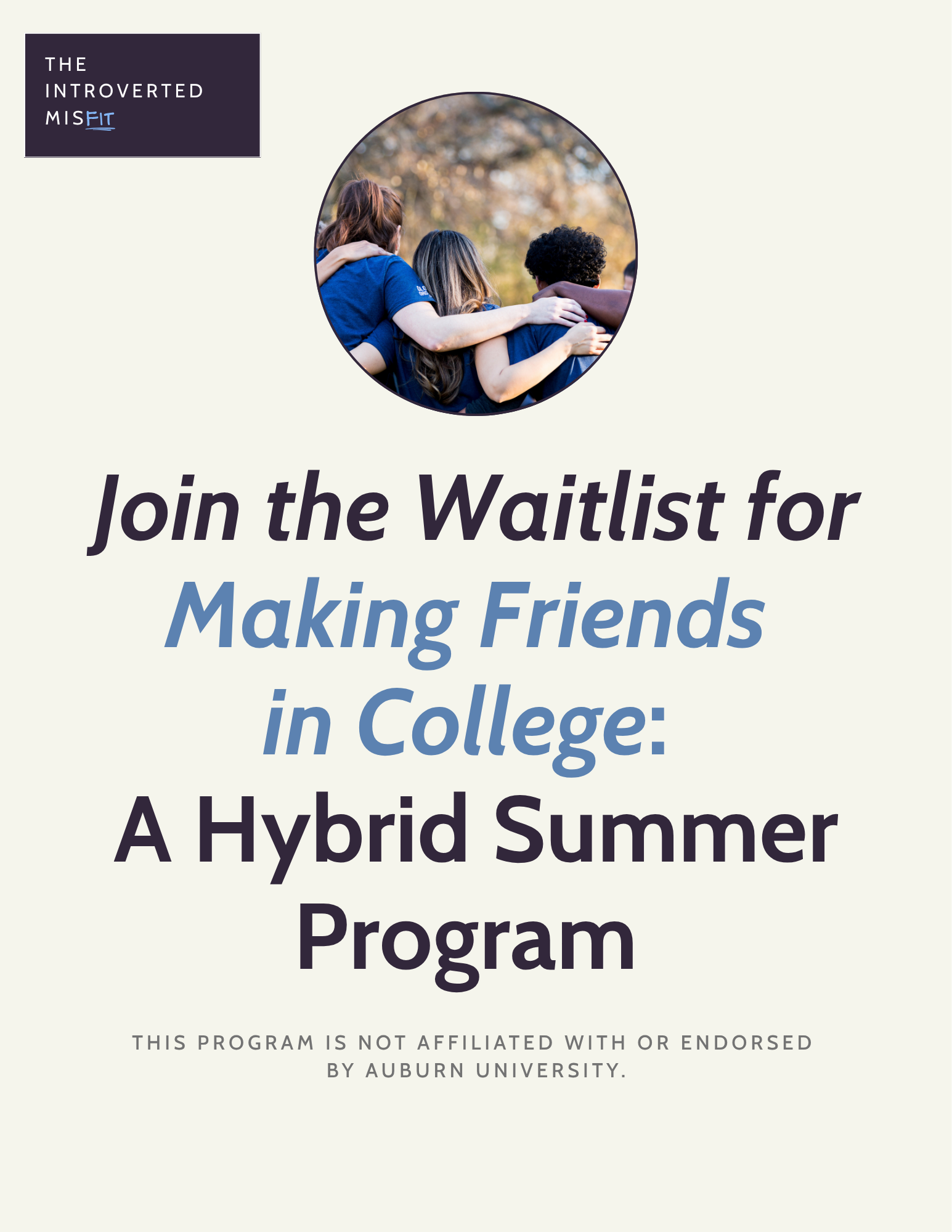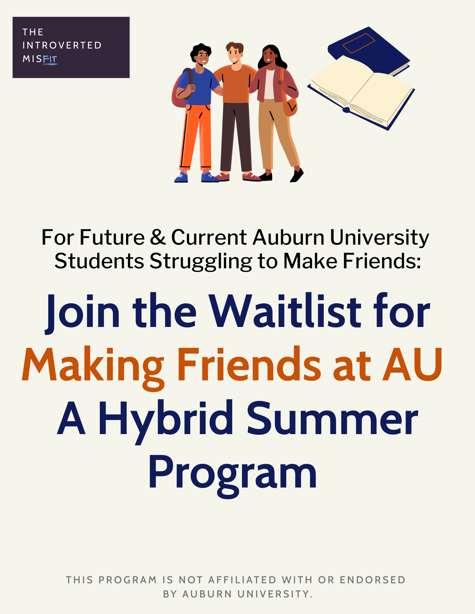If you’re a future or current student at Auburn University who has always struggled to meet people, make friends, and socialize in general, this hybrid summer program will help you make connections with other like-minded students on campus, learn the basic social and relational skills needed to make friendships work, and socialize with other participants in-person before fall semester starts.