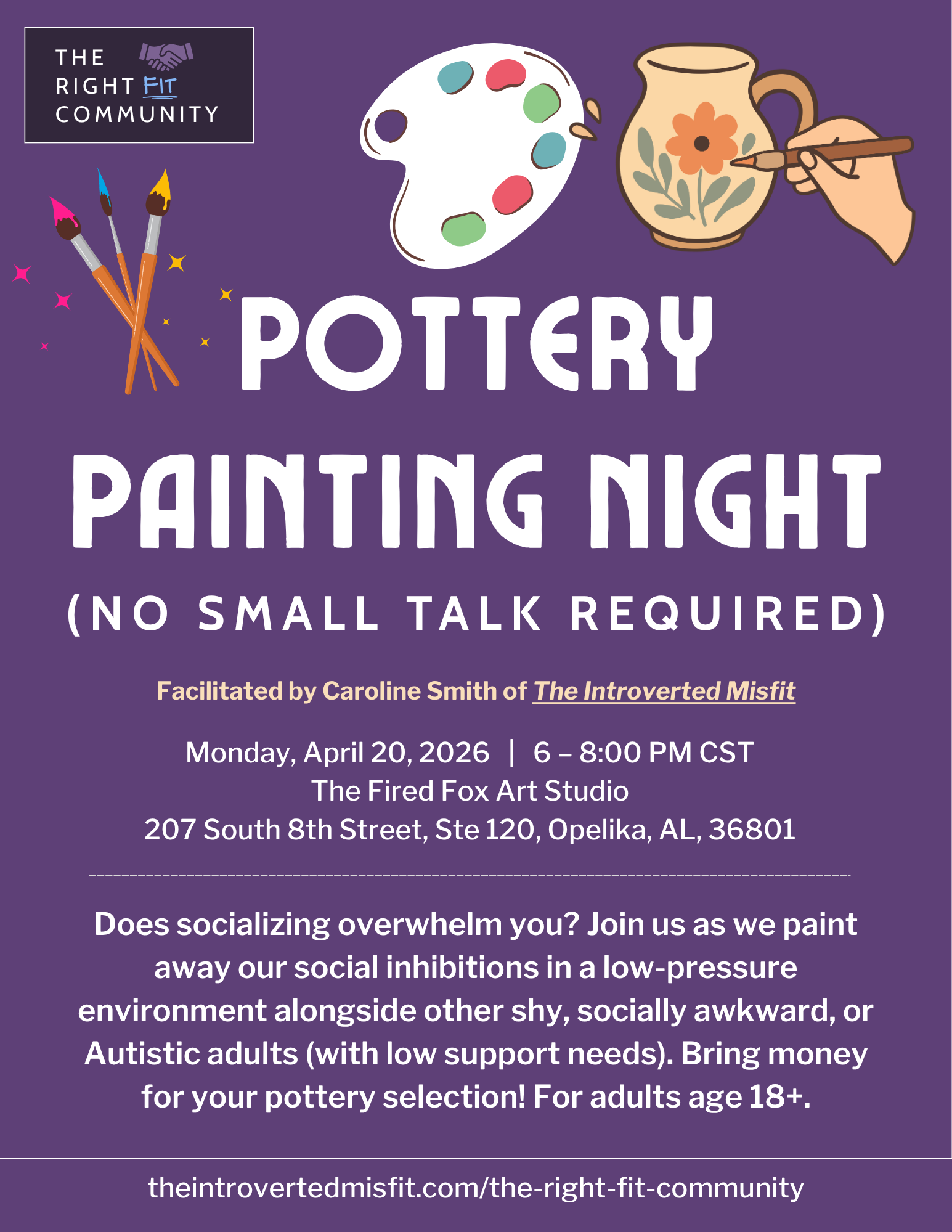 Does socializing overwhelm you, make you nervous, drained, or confuse you? Whatever your social struggles are, this meet-ups is the perfect place for you! Join us as we paint away our social inhibitions in a low-pressure environment alongside other shy, socially awkward, or Autistic adults with low support needs. It’s the perfect opportunity to embrace your creative side and take the pressure off socializing!