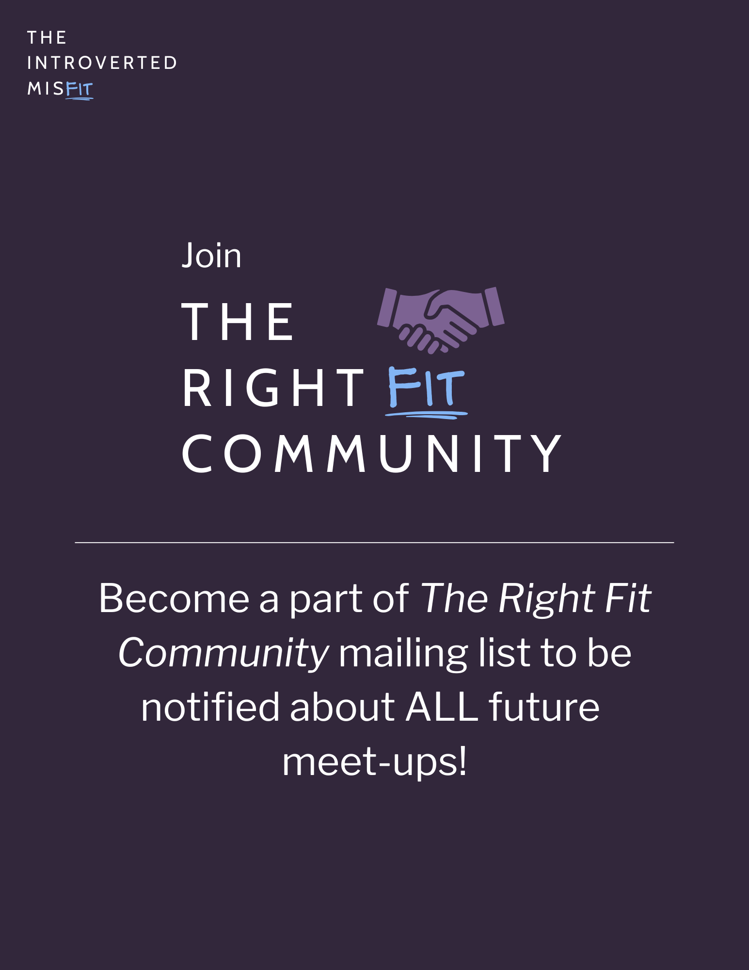 Tell your friends, family & colleagues all about The Right Fit Community so we can reach more people! The best place to send them is this page you’re currently on: theintrovertedmisfit.com/misfit-meet-ups